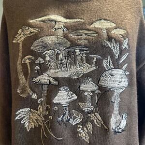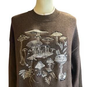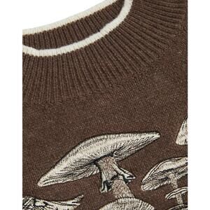 Cider Knit Round Neckline Mushroom Graphic Sweater, Coffee, Size 0XL (12/14), NWT. Cozy and nature inspired, this coffee knit sweater features a beautifully detailed white embroidered mushroom and botanical design across the front. Made with soft fabric and a relaxed, cropped fit. Ribbed neckline, cuffs and hem add a polished finish. 77% polyester, 13% acrylic, 10% polyamide. New with tags. #Cottagecore #Nature #Mushrooms