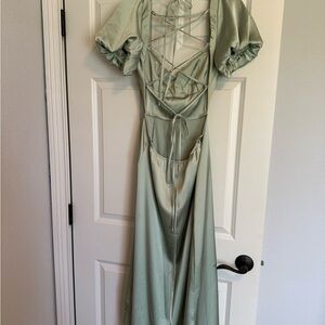 Chic mint green dress with puff sleeves. Features a stylish lace-up back. Perfect for any event.