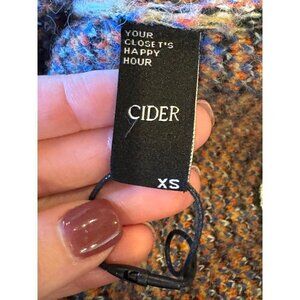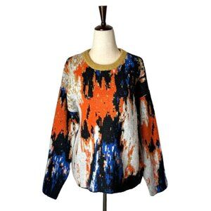 This sweater from Cider is in excellent condition. It is an orange and black print with multi-colors throughout. It features; Crew neckline, Long sleeves, Drop shoulders, Ribbed trim and a Straight hemline with pullover style. It is crafted from a nylon, acrylic and elastane blend.
