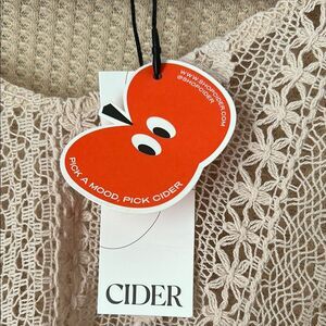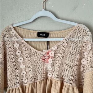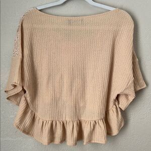 Cider Size M HOLLOW OUT RUFFLE HEM SHORT SLEEVE SHEER CROCHET TOP in Burlywood