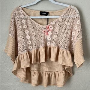 Cider Size M HOLLOW OUT RUFFLE HEM SHORT SLEEVE SHEER CROCHET CROP TOP in Burlywood
