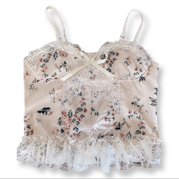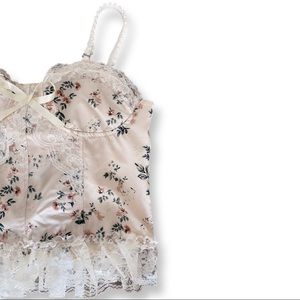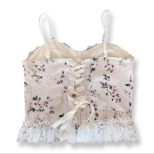Satin corset inspired top with lace trimming. Preowned: worn once. Great condition.