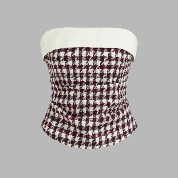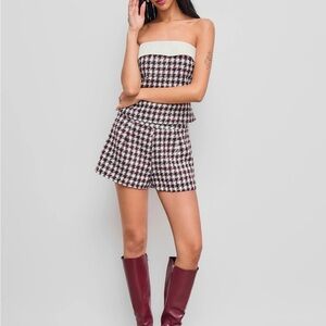 Stylish tube top with a burgundy and white houndstooth pattern. Strapless design. Perfect for chic outings.