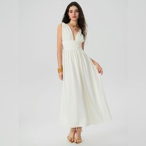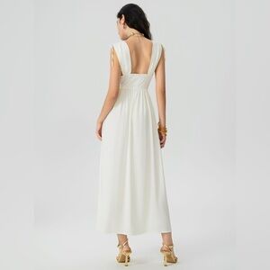 Super cute white maxi dress from Cider with adjustable cinching details at the shoulders. Size XS and in great preowned condition; small run in the fabric on the bottom back (see last pic) but it's not remotely noticeable when you're wearing it.