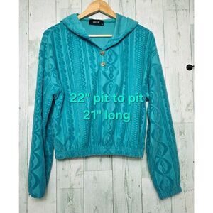 Cider Velour Oversized Debossed Cable Knit 1/4 Button Hoodie Teal Sz. Sm.