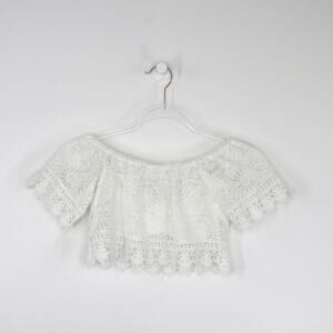 Cider White Lace Off Shoulder Babydoll Blouse with Crochet Eyelet Detail & Hem. Super Cute Summer White Lace Crop Top