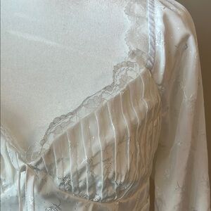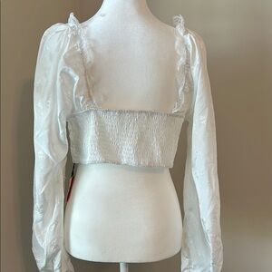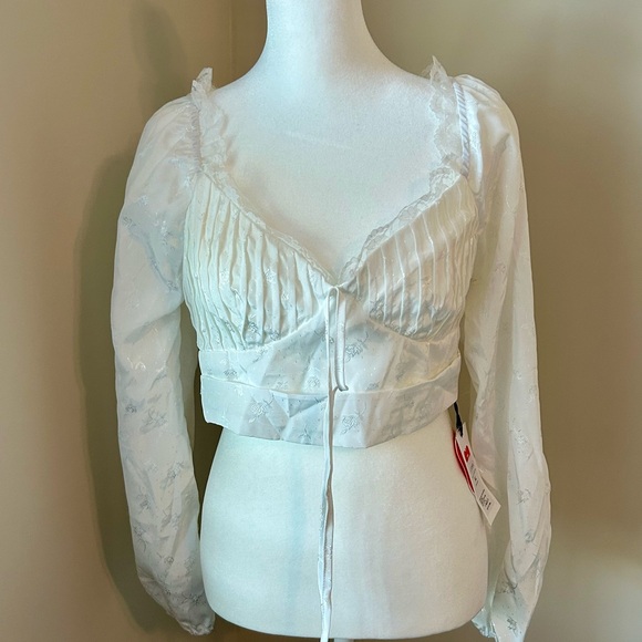 Chic white blouse with ruffled trim. Long sleeves and tie front. Perfect for stylish outings.