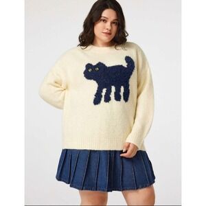 Cider Women's Ivory Black Cat Graphic Crewneck Sweater size 1XL Wool Blend