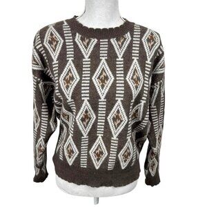 Cider Women's XL Scalloped Edge Crew Sweater Brown Geometric Metallic