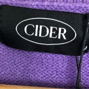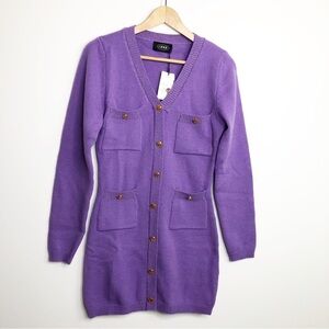 Cider purple button-down knit sweater dress with gold buttons and metallic shimmer throughout.