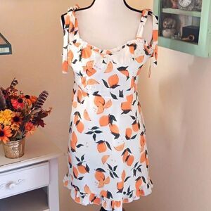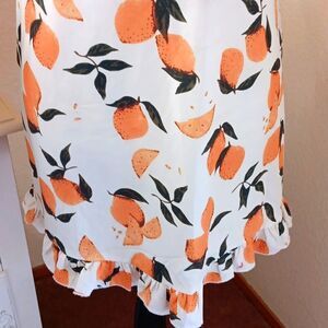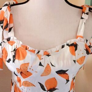 Bright fruit decorates this sunny dress. You'll be smiling! Ruffles at the bottom and top. Straps to tie at the shoulders. Elastic shirring on the back for fit. Side zip. Bra front. Bo content tag. but a cotton poly blend. . Size M measures 36 at chest, 28 under chest, 38 at hips, 31.5 long from shoulder to hem. This is a real cutie!