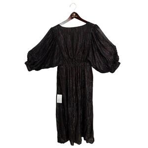 Ciebon Gayley maxi dress in black with metallic rainbow stripes and a floaty, full-length silhouette. New with tags, size Small. Features long balloon sleeves, front button accents, and shimmery stripes in pink, blue, silver, yellow, and gold that catch the light. Boho-meets-modern style that works for weddings, festivals, Pride, or holiday parties. Can be styled with western boots, platforms, or a leather moto jacket from my closet for contrast.