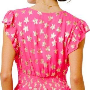 Dazzling stars spangle a flamingo-pink maxi closed down the center with pearly buttons and finished with swishy ruffles at the shoulders and hemline.