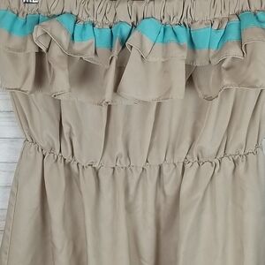 Taupe, peach orange teal green multicolor with stripe pattern at hem, ruffle at bust, very good elastic stretch at bust