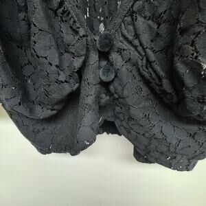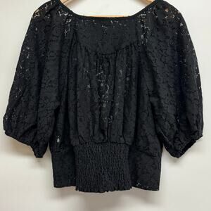 Gorgeous black lace blouse by Cielo featuring a floral lace overlay, puff sleeves, smocked waist, and velvet button front (one button may need a simple stitch).