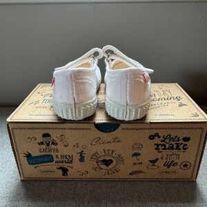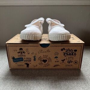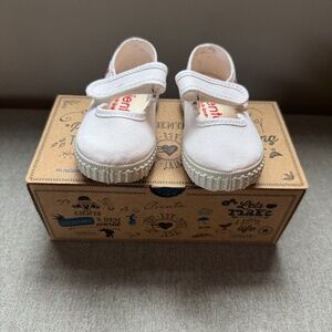 White, European size 19/US toddler size 3.5. Velcro closure. Never worn, but there is a tiny spot on one of the straps as pictured.