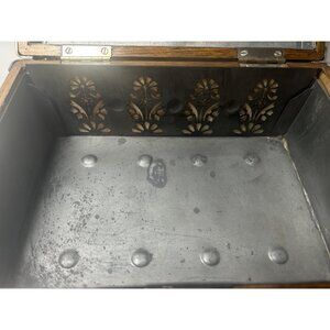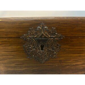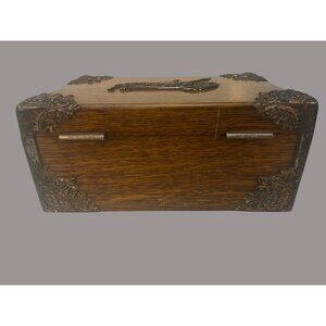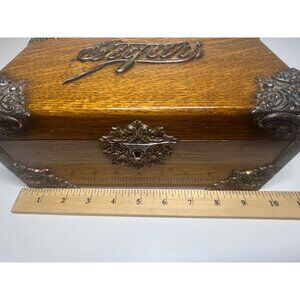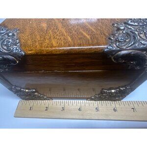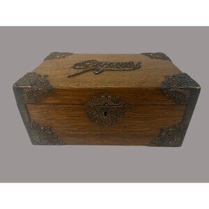 Cigar Box - Antique circa 1890s - Tiger Oak with Metal Ornate Corner Mounts