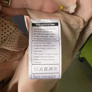 Gorgeous leather jacket. Lined. Has a pinky tan color as shown. Some minor discoloration as shown in photos. Could be cleaned professionally. Pit to pit measures 18 inches across front. Length measures 22 inches from shoulder to hem in the back.