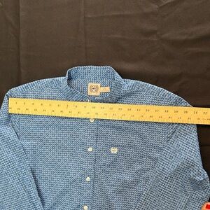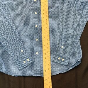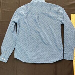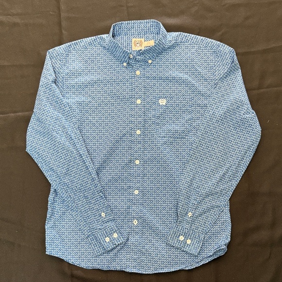 Cinch long-sleeve button-down with small repeating geometric print. Button-down collar and full front placket. Embroidered logo on the chest. Lightweight woven fabric for comfortable wear.
