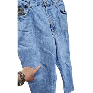 The Cinch Jeans Black Label in size 36 x 36 are a stylish and comfortable pair of denim pants for men. These jeans feature a classic denim fabric type, a mid-rise, and a 5-pocket design with a zipper and button closure. With a blue solid color and a bootcut style, these jeans are perfect for the summer, fall, and spring seasons. The Cinch brand adds a touch of cowboy and Southwestern flair, making these jeans a versatile and fashionable choice for any wardrobe. Made of cotton and machine washable, these jeans are easy to care for and designed for comfort. CLOTHING AND FABRIC ITEMS: All clothing and fabric items have been steam cleaned and/or washed. Dark area of discoloation as shown, approx 1"