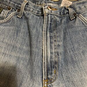 This jeans are distressed in front of on legs. Everywhere is good. Green label. 35X32.. Legs are 9 inches across at bottom.