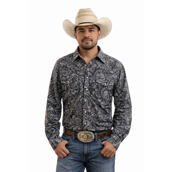 Add a touch of western style to your wardrobe with this Cinch button-down shirt. Featuring a beautiful floral pattern and a collared neckline, this shirt is perfect for any casual occasion. The long sleeves and woven cotton fabric make it suitable for all seasons, while the easy-care and pocket features add convenience to your daily routine. This shirt is available in size Men's Large and is machine washable. The snap button closure and button-down collar style give it a classic look, while the accents and theme of the shirt add a unique touch. Made in Vietnam and suitable for both winter and fall seasons, this shirt is a great addition to any fashion-forward men's wardrobe.