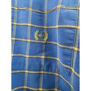 This shirt offers a classic plaid design in a blue and yellow color scheme, complemented by a button-up style.
