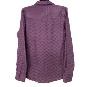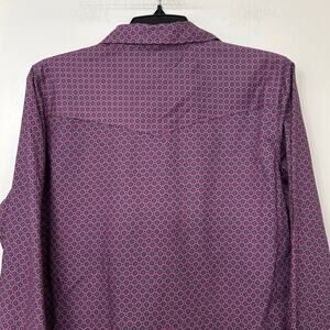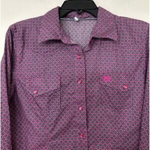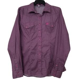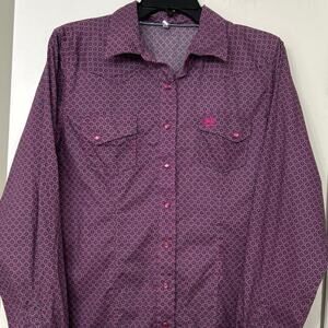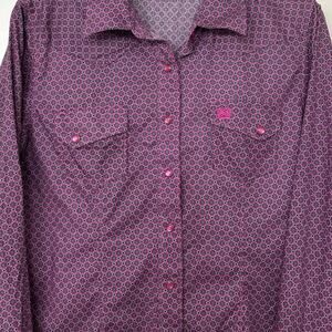 Stylish purple blouse with intricate pattern. Features button-up front and chest pockets. Perfect for casual or dressy occasions.