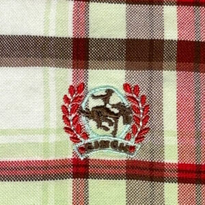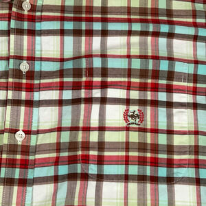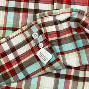 • Brown, red, green, and white cotton plaid cotton long sleeve shirt