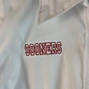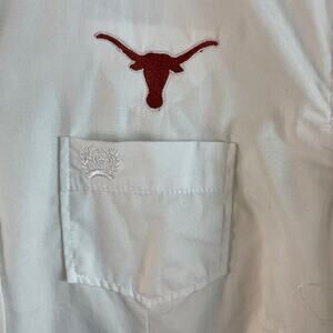 Cinch White Shirt displaying both the OU Sooners & Univ. of Texas Longhorns logos. Size Medium. 100% cotton. Long sleeves with button front & left pocket displaying the Cinch logo. Sooners embroidered at right chest and Longhorn above pocket. Buttons are etched with Cinch brand. A unique shirt showing support for both teams. Like new condition.