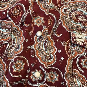 Featuring a beautiful burgundy and turquoise print and pearl snap closures, this shirt is perfect for any occasion.