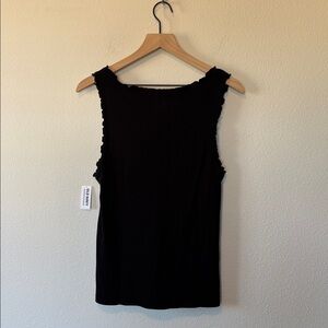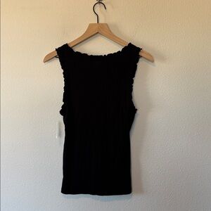 Cute ribbed tank with ruffled edges, cinched front, and decorative tiny flower. New with tags!