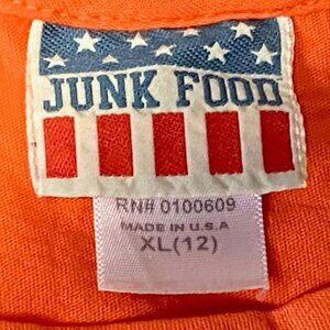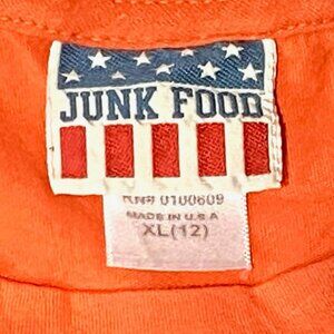 Check out this awesome NOS (New Old Stock) girls XL (12) Bengals glitter tee that was made by those great calorie counters at Junk Food. The Bengal orange tee's cotton/glitter construction makes for a great-looking t-shirt in any environment. With original tags, we measured the shirt for comparison and measured 15" across the chest and 22" from top to bottom. It makes for a terrific gift! Be sure to check out the photos. 100% Cotton. Made in the USA.