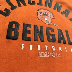 The product is a Cincinnati Bengals throwback helmet logo hoodie, officially licensed by the NFL. This hoodie features the iconic team logo in orange color, making it a perfect fan apparel for supporters of the Cincinnati Bengals. Made in size L for men, it is a stylish sweatshirt perfect for football enthusiasts to show their team pride while staying warm and comfortable.