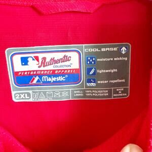 Cincinnati Reds Authentic Collection Performance Apparel Cool Base Spring 2008 Starter Practice Jacket Windbreaker Funnel Neck 2XL. Cool base. Moisture wicking. Light weight. Water repellent. Good, preowned condition. 100% polyester. Machine wash. Quarter zip neck. Long sleeves can be unzipped and removed to reveal short, black sleeves. Reds logo on chest. Mr. Red Legs on left shoulder. MLB logo on back of funnel neck. Waist is adjustable with pull tab at bottom hemline.