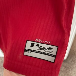 Red performance shirt with Dri-Fit technology. Features Authentic Collection label.
