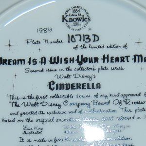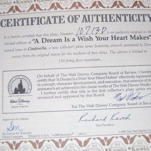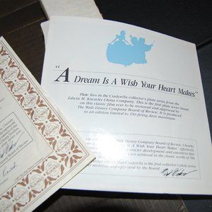 Disney's Cinderella comes to life in the magnificent plate, "A Dream is a Wish Your Heart Makes". Limited Edition featuring artwork translated by Disney artists from the original film into fine porcelain. Mint condition! Comes with COA, original box, and other paperwork. Made in 1989, 8.5" in diameter.