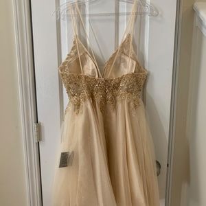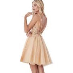 Details: Spaghetti Straps, Illusion Inset, Beaded Lace Appliques, Low Open Back, Back Zipper Closure, Layered Glitter Tulle, Short Hem