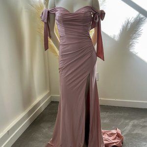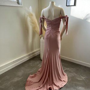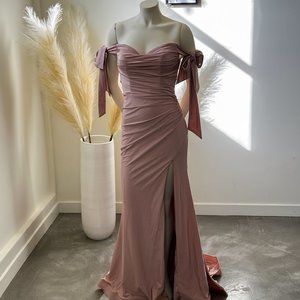 CD943 Fitted Off Shoulder Gown by Cinderella Divine Size 6 & 8 Color: Mauve Fabric: Fitted Stretch Luxe Jersey Dress
