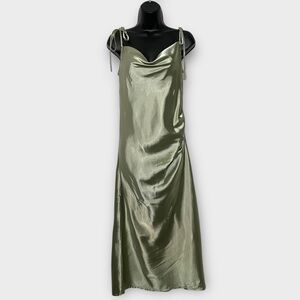 Cinderella Divine Green Satin Self Tie Spaghetti Strap Midi Slip Dress. Size Small. In good condition. Has a draped cowl neck. Comfortable fit. Great for going out or date night. Discount on bundles :)