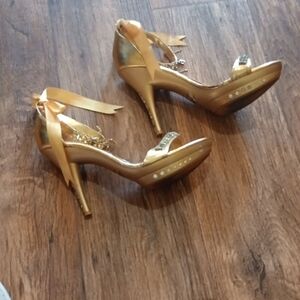 Elevate your evening attire with Cinderella's stunning gold stiletto heels. These elegant shoes feature a sophisticated two-strap design adorned with rhinestone embellishments, adding a touch of glamour to any formal occasion. The metallic gold finish enhances their luxurious appeal, making them a perfect choice for a night out or a special event. preowned has minor flaws