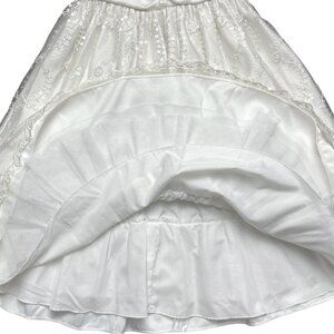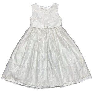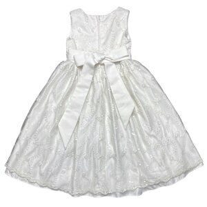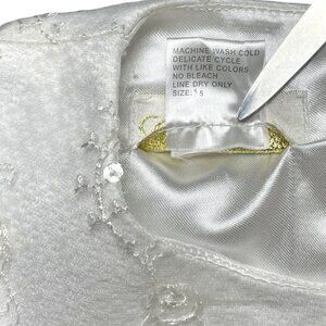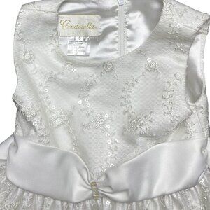 Cinderella long, sleeveless formal/party princess dress in solid white with embroidered lace and sequins overlay, satin sash ties, tulle trim on underskirt, and back zipper closure. Size 5