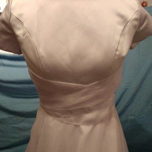 A beautiful A-Line Lavender prom dress that will make you feel like Cinderella. You can wear it with or without a petticoat. It has a long sheer fabric to be wrapped around and tied in a bow in the front or back. The backing is a zipper hidden by cute buttons down the back (easy to put on while looking adorable).