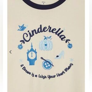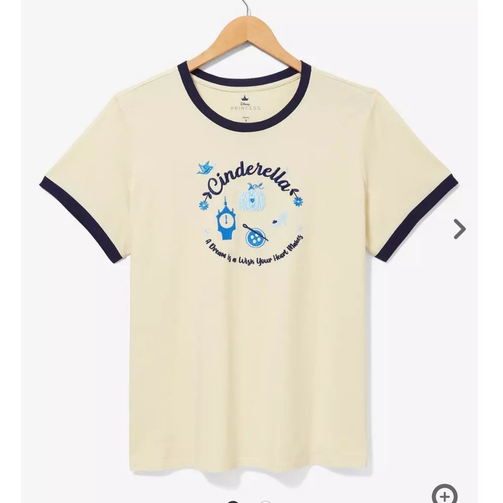 This cream-colored ringer tee features dainty details of an embroidered pumpkin, glass slipper, a clock, and a needle and thread, all surrounded by Cinderella's name and "A dream is a wish your heart makes" lettering. Worn once.