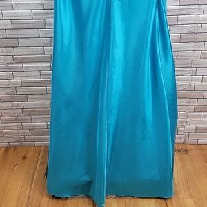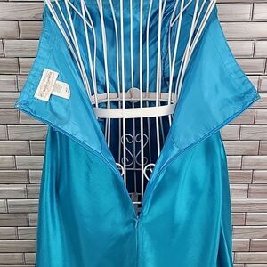 A vibrant turquoise blue strapless special occasion maxi dress by Cinderella divine with a classic empire waistline giving way to a full length a-line skirt. Great pre-owned condition.