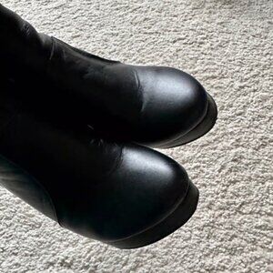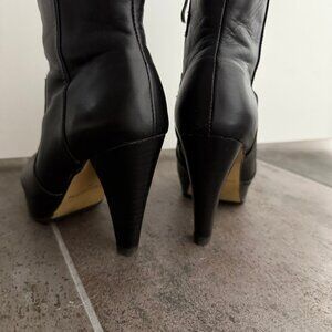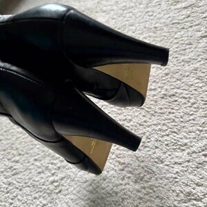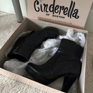 Stylish black platform ankle booties from Cinderella of Boston. Originally $79. Women’s size 3 with approximately a 4-inch heel. The soles and heels were professionally redone, so they’re in excellent wearable condition with lots of life left!