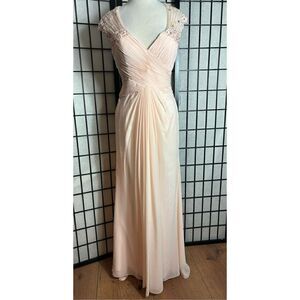 Cap sleeves embroidered/rhinestone adorned padded top sweetheart neck chiffon overlay fully lined evening dress
