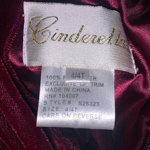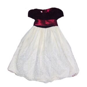 Gorgeous dress !!! Maroon velour top with a fully ivory skirt. Skirt is lined and and some tulle to fluff it out and sheer overlay with lace detail. Zips up the back and ties at the waist. In good condition