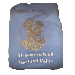 Gorgeous Cinderella silver glitter cameo. Has a cameo on the right chest and a larger one on the back with Cinderella’s most known saying, “ A dream is a wish your heart makes.” The sweatshirt used is Jerzees so it is very high quality. It will last for a very long time! Perfect for gifts, a family/ friend trip or just because!!