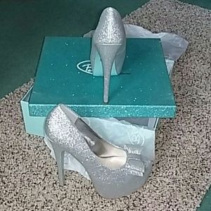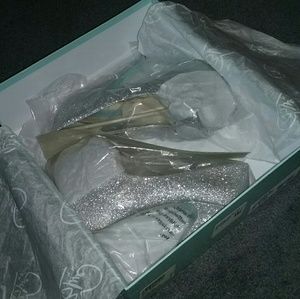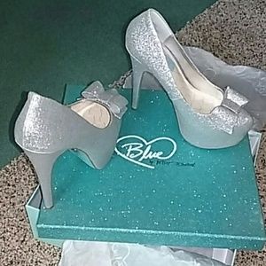 Stunning show-stopping special occasion shoes! Blue by Betsey Johnson Gala silver glitter platform pumps with bow detail. 5" heel, 2" hidden platform, comfortable cushioned footbed. Size 7.5 B. Brand new in box, never worn. Absolutely amazing, very sexy shoe. Wedding, prom, graduation, homecoming... a royal ball??
